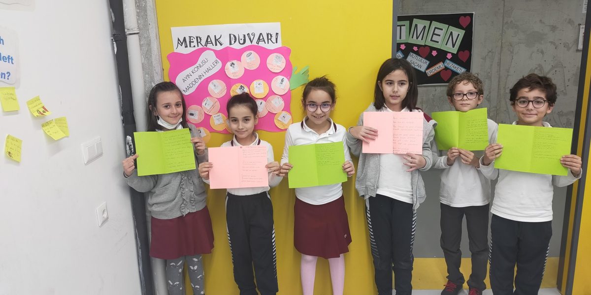 3. Sınıf öğrencilerimiz Fen Bilimleri dersinin “Maddenin Halleri” konusu kapsamında, Fen laboratuvarında deneyler yaptılar. Maddenin katıdan sıvıya, sıvıdan gaza ısı alarak dönüşümünü, gaz halindeki maddenin ısı vererek sıvı hale geçişini gözlemlediler. Farklı maddelerin özelliklerini yazarak sınıflarındaki “Merak Duvarı”na astılar. Konuyla ilgili şiir yazdılar ve eserlerine konuya uygun görseller eklediler.