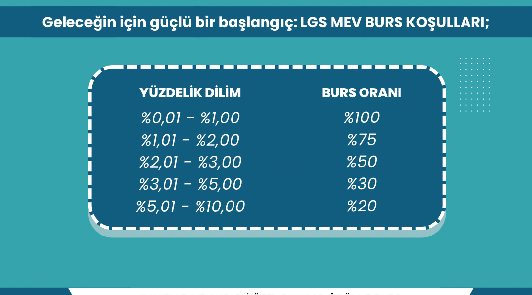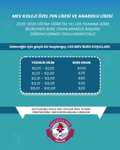 MEV KOLEJİ ÖZEL ANADOLU VE FEN LİSELERİNE 2025-2026 EĞİTİM ÖĞRETİM YILINDA LGS SONUCUNA GÖRE BURSLU ÖĞRENCİ ALINACAKTIR.