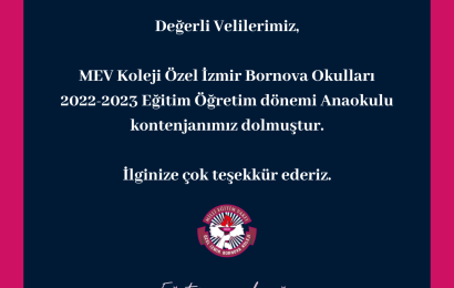 Değerli Velilerimiz, MEV Koleji Özel İzmir Bornova Okulları 2022-2023 Eğitim Öğretim dönemi Anaokulu kontenjanımız dolmuştur. İlginize çok teşekkür ederiz.