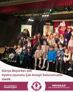 27 Mart Dünya Tiyatrolar Günü etkinlikleri kapsamında, Okul Aile Birliğimizin katkılarıyla anaokulu ve 1, 2, 3. sınıf öğrencilerimize yönelik keyifli bir etkinlik gerçekleştirdik. Öğrencilerimiz “Dünya Büyürken” adlı tiyatro oyunu ile buluşarak hem eğlendi hem de tiyatronun büyülü dünyasını keşfetti.