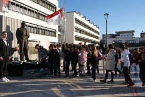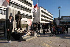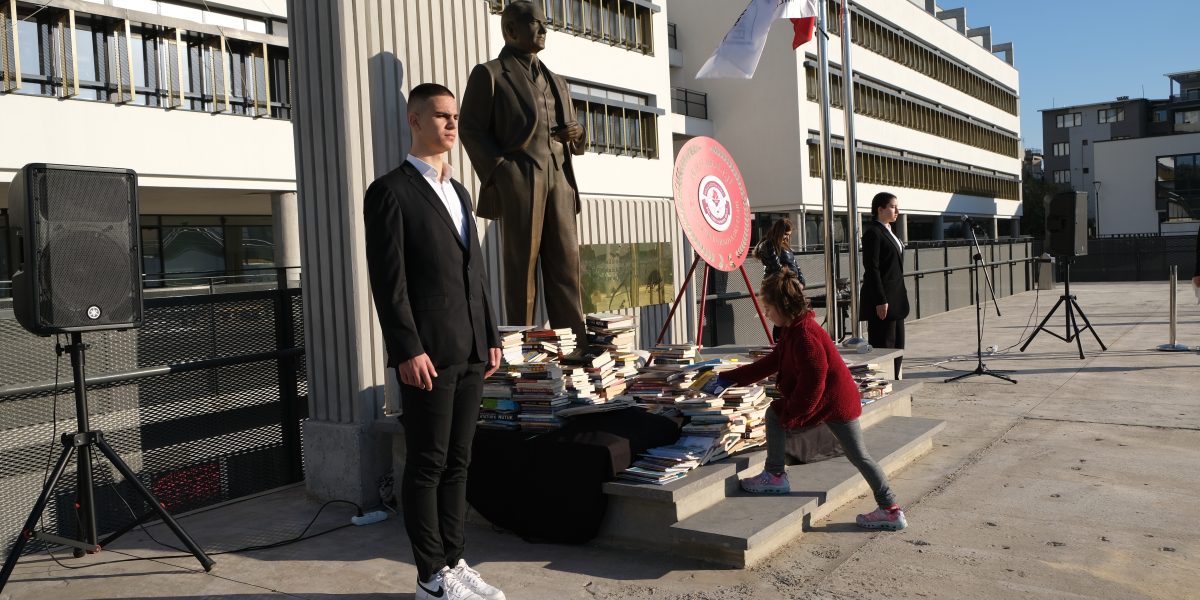 Başöğretmen Mustafa Kemal Atatürk’ün aramızdan ayrılışının 84’üncü yıldönümünde gerçekleştirdiğimiz törende, Atatürk büstümüze tüm öğrencilerimiz, öğretmenlerimiz ve çalışanlarımız birer kitap bıraktı. Toplanan kitaplarımızı, Atamızın eğitime, okumaya verdiği öneme dikkat çekmek, bu yolda yaktığı meşaleyi hep canlı tutmak amacıyla, kardeş okullarımızın kütüphanesine bağışlayacağız.