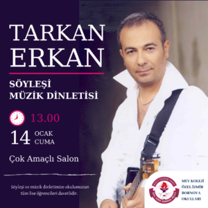 Ege Üniversitesi Devlet Türk Müziği Konservatuarı Öğretim Görevlisi, Devlet Tiyatroları Genel Müdürlüğü şirketinde Devlet Tiyatrosu-Besteci-Koreograf, Büyük Türkiye Orkestrası Kurucusu ve Şefi, Folk-Rock Şarkıcısı Tarkan Erkan, Alternatif Rock müzik hakkında gerçekleştireceğimiz söyleşide lise öğrencilerimizle bir araya gelecek. Küçük bir müzik dinletisinin de yapılacağı söyleşimiz, 14 Ocak Cuma günü, saat 13.00’da Çok Amaçlı Salonumuzda gerçekleşecek.