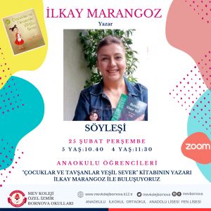 Anaokulu 4 ve 5 yaş grubu çocuklarımız, “Çocuklar ve Tavşanlar Yeşil Sever” kitabının yazarı İlkay Marangoz ile 25 Şubat Perşembe günü zoom platformu üzerinden yapılacak söyleşide bir araya gelecek.